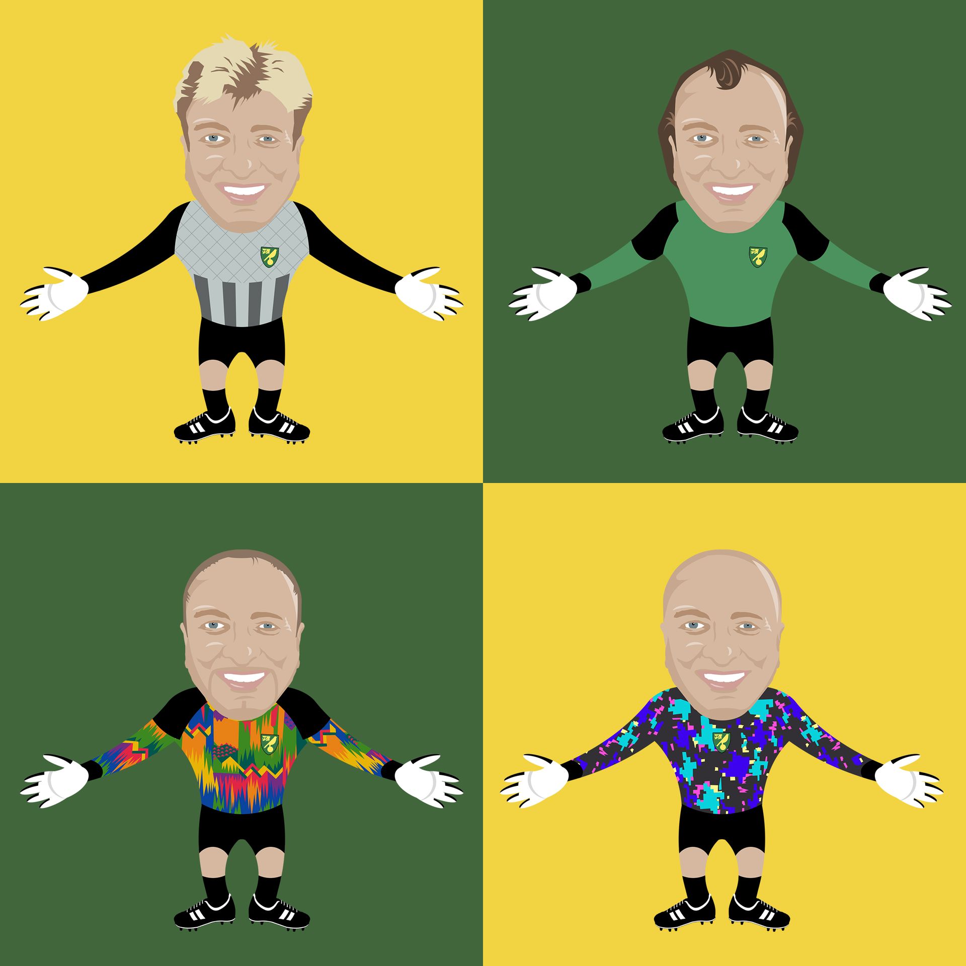 For the 2019/20 season I was invited to collaborate with both the programme editor and designer to create the cover illustrations for the club's matchday programme, OTBC. Based around a series of modern/retro player images which I had previously produced, inspired by football sticker albums, the covers placed contemporary players in classic kits of Norwich City and each game's opposition.